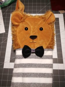 Matières : polar, minky, polyester, yeux de sécurité en plastique. Il possède une doublure pour plus de solidité