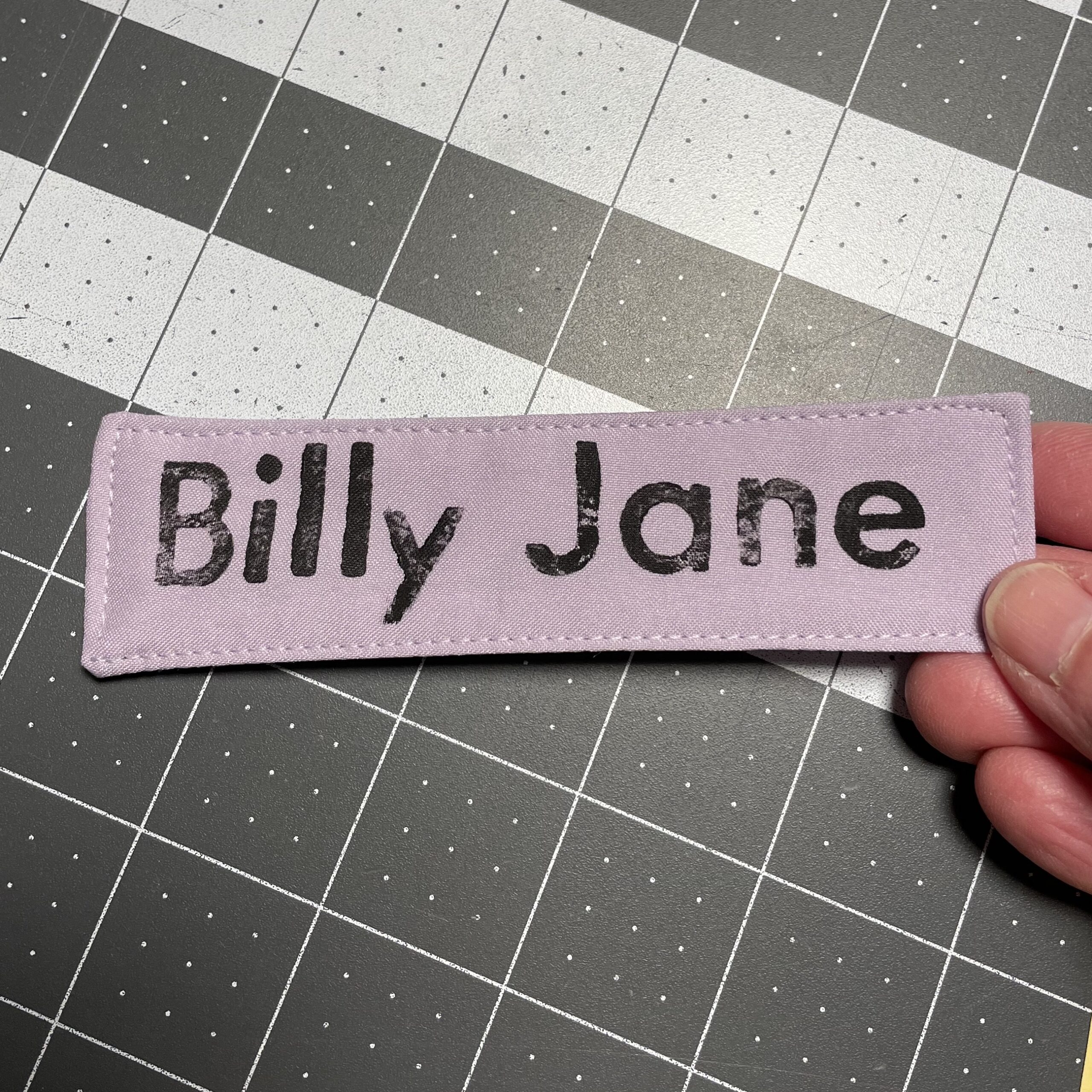 De quelle façon le nom est-il fait ? Je procède avec la méthode suivant : à l’aide d’estampes en forme de lettres et de peinture pour textile, j’inscris le nom choisi sur un tissus de coton (une couleur vous sera proposée au moment de la conception). La peinture est ensuite fixée au fer à repasser, elle ne partira pas au lavage.